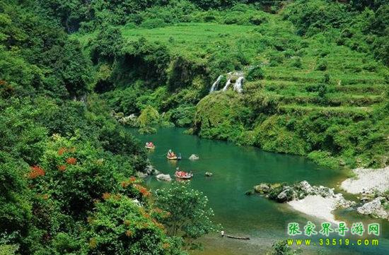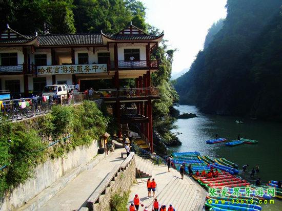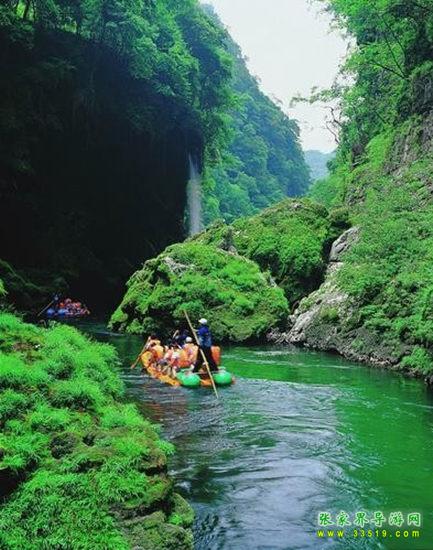 天下第一漂,起點(diǎn)哈妮宮距王村約40公里,行車1小時(shí),終點(diǎn)牛路河距王村30分鐘的車程,漂流水路長17公里,漂流兩個(gè)半小時(shí)。從哈妮宮放舟而下,一路是古老的河道,絕壁百里,怪石嶙峋,灘奇水異,兩岸蒼翠的林木,云霧繚繞,飛瀑流泉與溶巖峰林交相輝映。拐一百五十五個(gè)彎,在一百三十三個(gè)灘潭中穿梭而行,迂回流連,馳魂奔魄,心曠神怡。