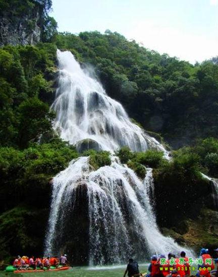捏土是土語,最美的意思。此瀑布高達(dá)30多米,寬50多米。瀑布上面飛云走霧,下面一派煙雨,綠樹蔥蘢,怪石嶙峋。捏土的奇妙在于水潭中的這兩塊石頭。這石頭嵌在水中,宛若沉舟,又似石屏。這里有努力卡巴大王斷船故事。當(dāng)初這兩塊石屏本為一體,后來不知哪山仙人在石屏上題七律詩一首,并說有誰能通讀此詩河中獻(xiàn)金船一首。說來也怪,一晃不知過了多少年,從此經(jīng)舟人千萬,無人通讀,有一天努卡巴大王乘舟經(jīng)過此地,也想破石屏之讀出26字時(shí),大王見遠(yuǎn)遠(yuǎn)的水潭中浮現(xiàn)一金船,高興不已,心想破二字金船就可手,水中之物變成獨(dú)家之寶、享不盡的富貴。大王又破一字,字出船到,大王見金船已眼前,驚喜如狂,不覺最后一字讀錯(cuò)。隨著錯(cuò)字音出,金船忽然離去,慢慢欲沉,大王見勢不妙,忙拔劍去挑,不料金船成兩截,沉落潭中,變成兩具彩石,大王百思不解,帶著遺憾的心情離開了,后人又留下一詩:“莫笑古人莫罵天,天財(cái)?shù)貙氃谘矍?。待到天地人和時(shí),金船總會(huì)來人間”。如今已是天地人和時(shí),金船也確實(shí)來到了人間(指漂流船)。